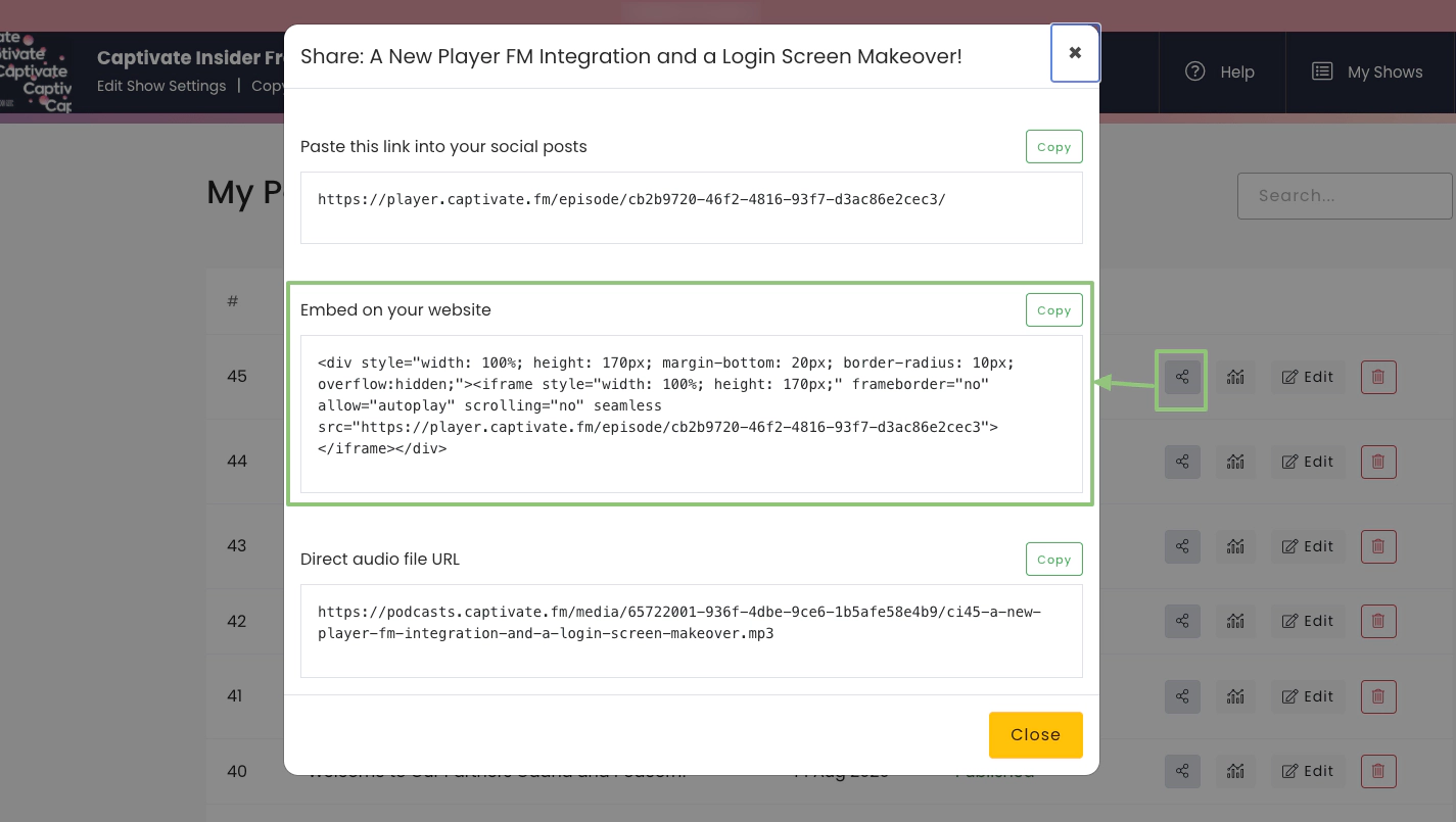 Go to the episode you’d like to embed from your Captivate dashboard and click the Share icon, then copy the Embed code.