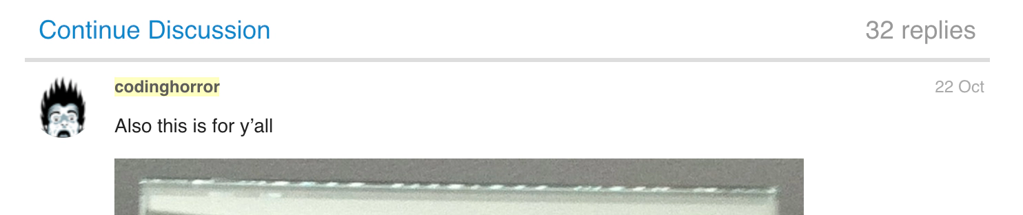 Once you’ve done this, all that’s left is to update your active theme by uploading a fresh .zip in Ghost Admin in the Design settings. The next time your existing posts are visited, the Discourse thread will be created, and you’ll be able to see the comments function at the bottom of your posts. Here’s an example of what it looks like on Coding Horror’s site: