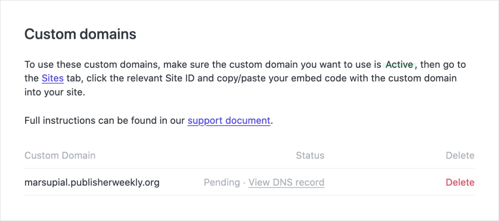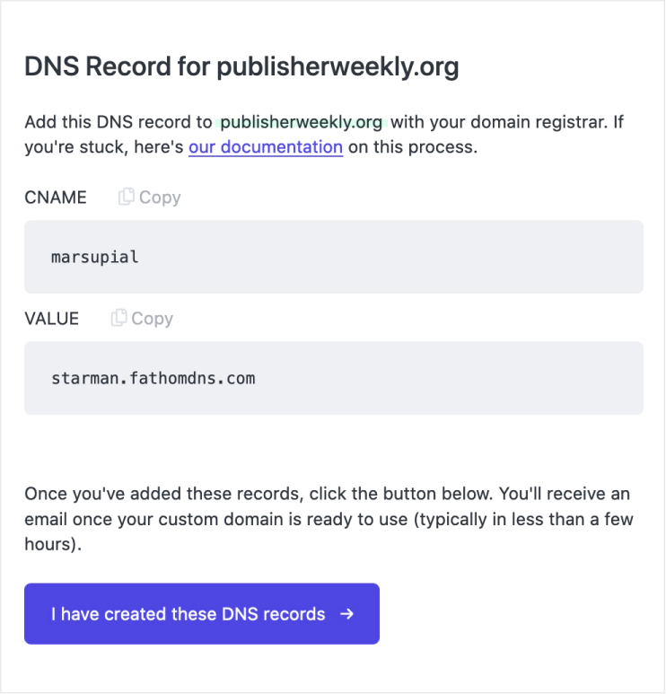 Add these records to your DNS settings and then wait for everything to resolve, you can check the progress from the Custom domains page: