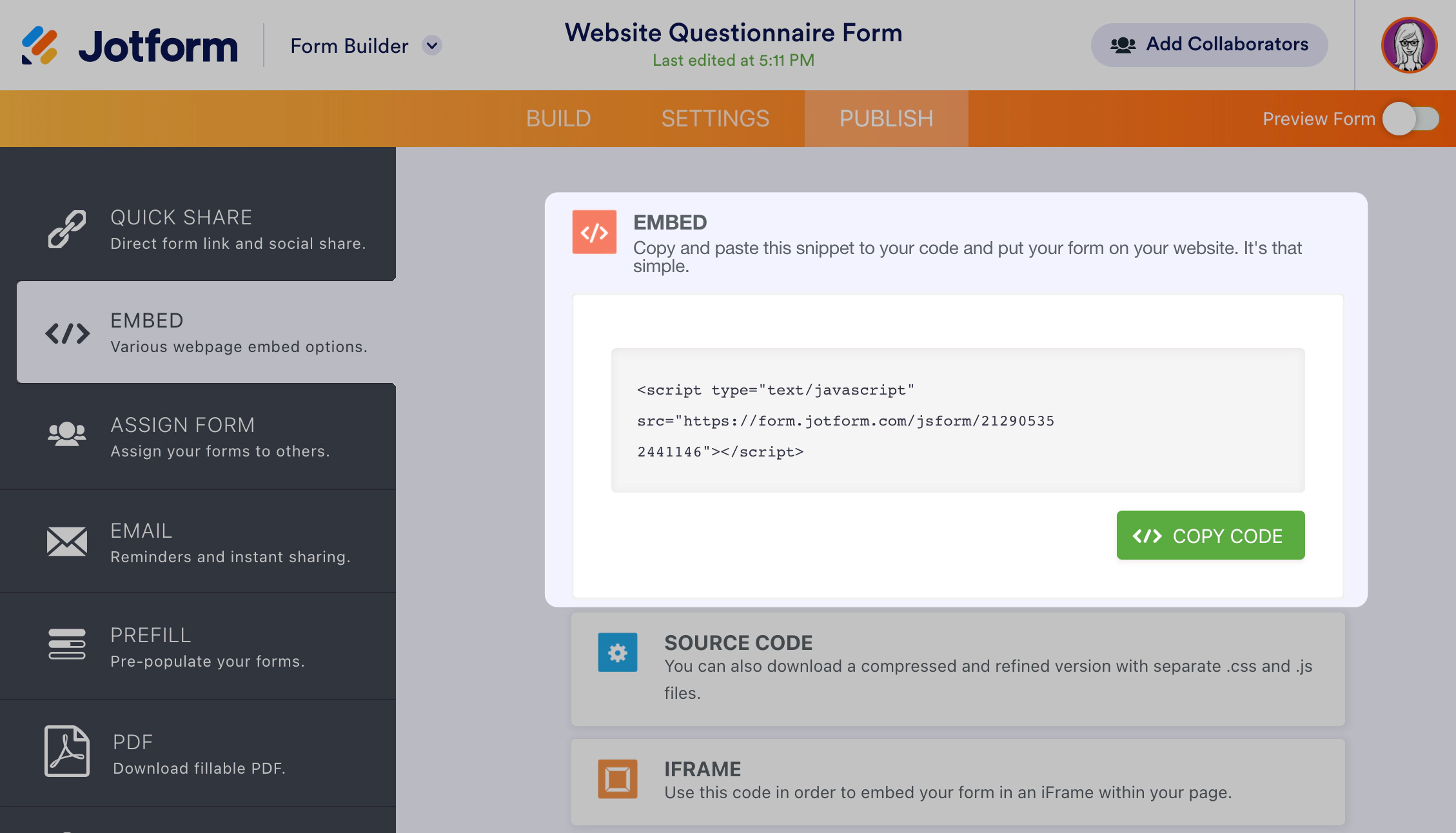 Next, navigate to the embed menu from the publish options and copy the provided JavaScript embed code from the share page to your clipboard.