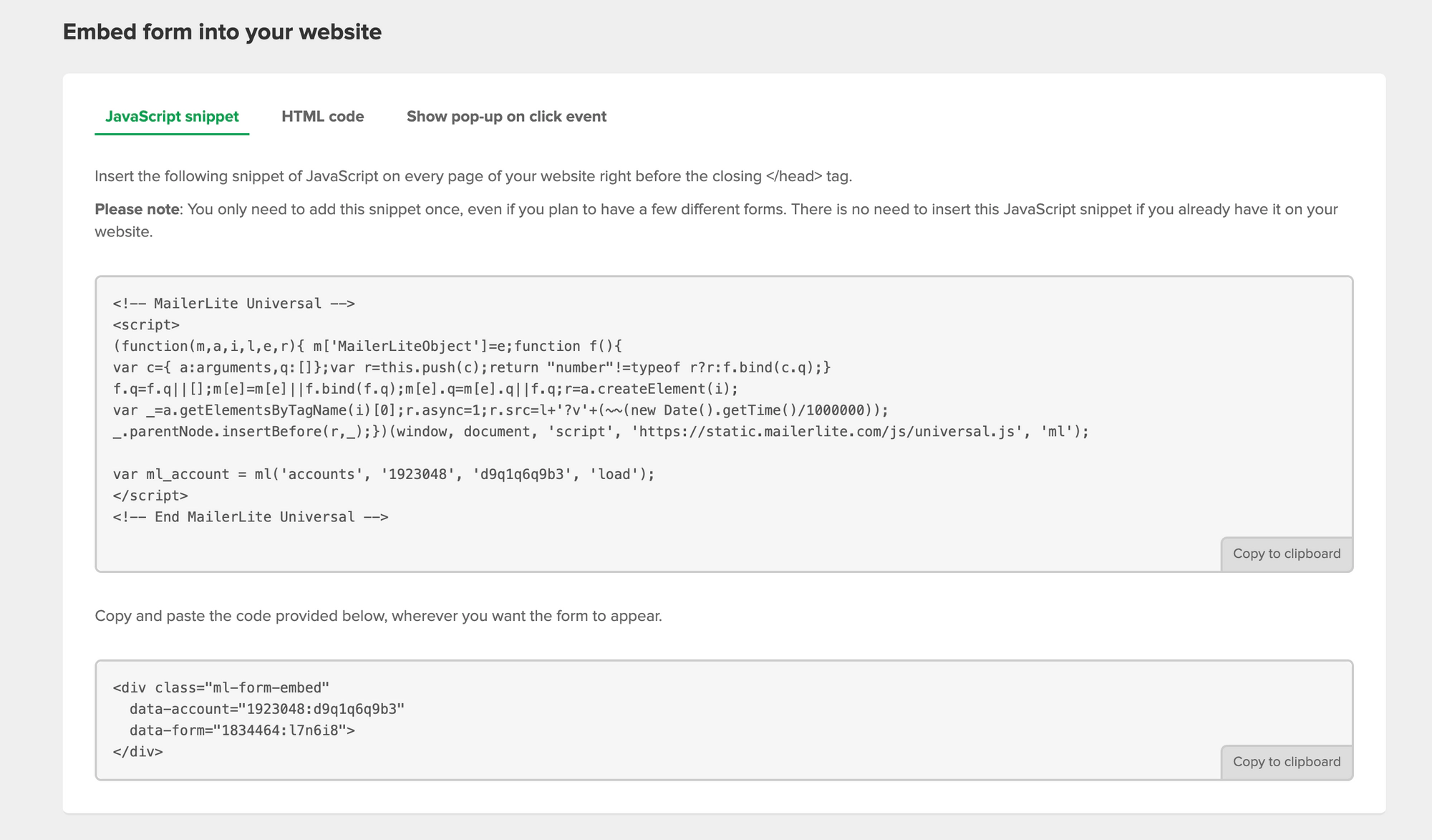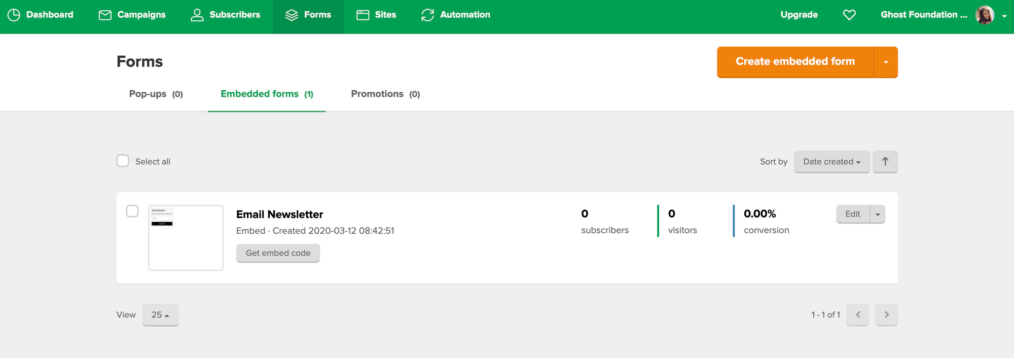 If you’d like to use one of Mailerlite’s own subscriber forms directly, that works too! You can use absolutely any embedded forms or popup options provided by Mailerlite within Ghost.